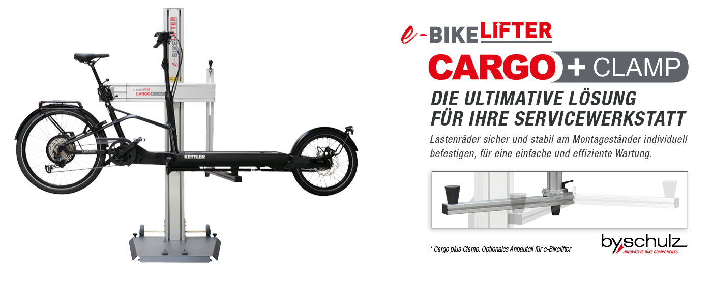 Mit der neuesten Entwicklung – der Cargo Plus Clamp – können nun auch Lastenfahrräder einfach und sicher gehoben werden.